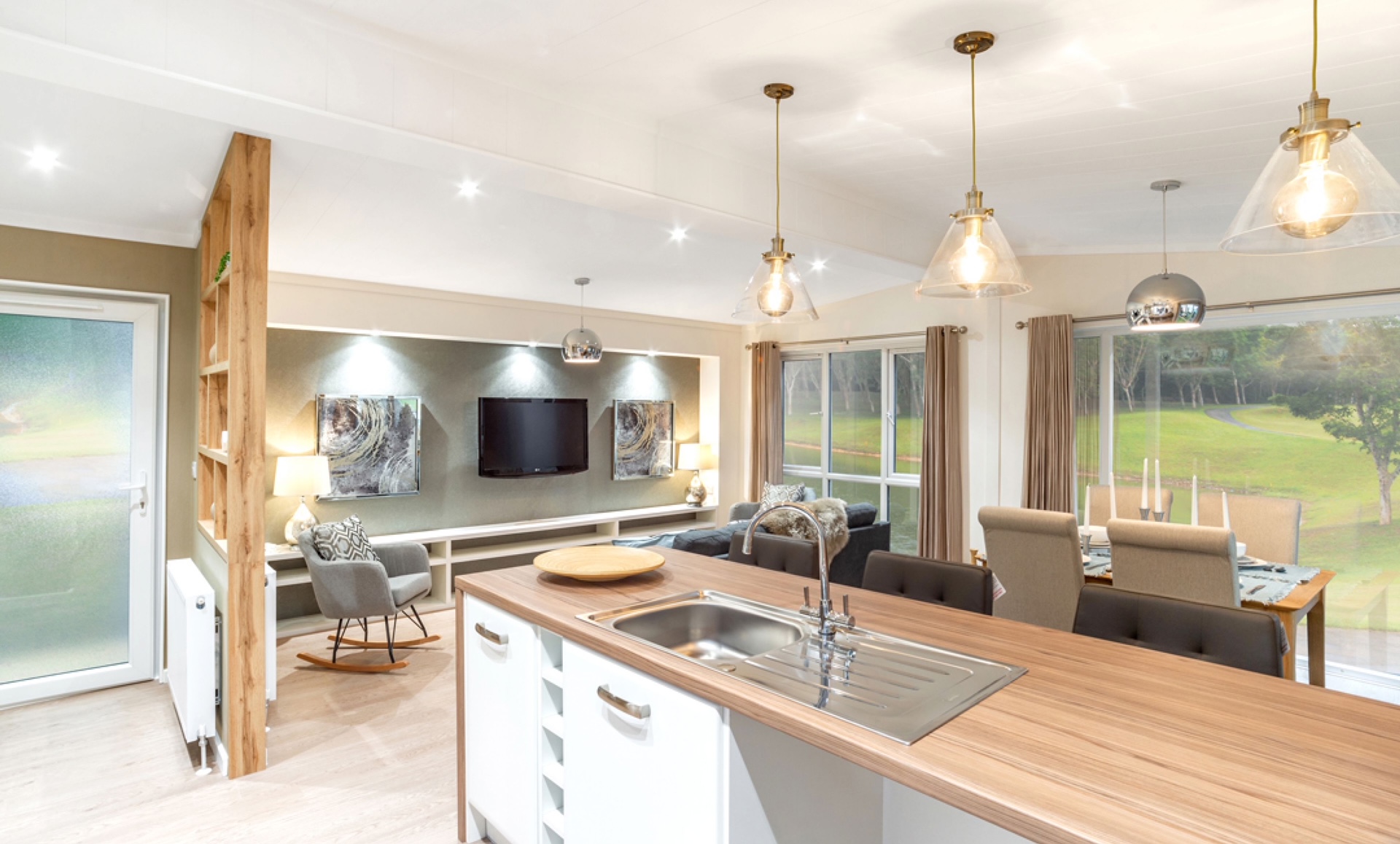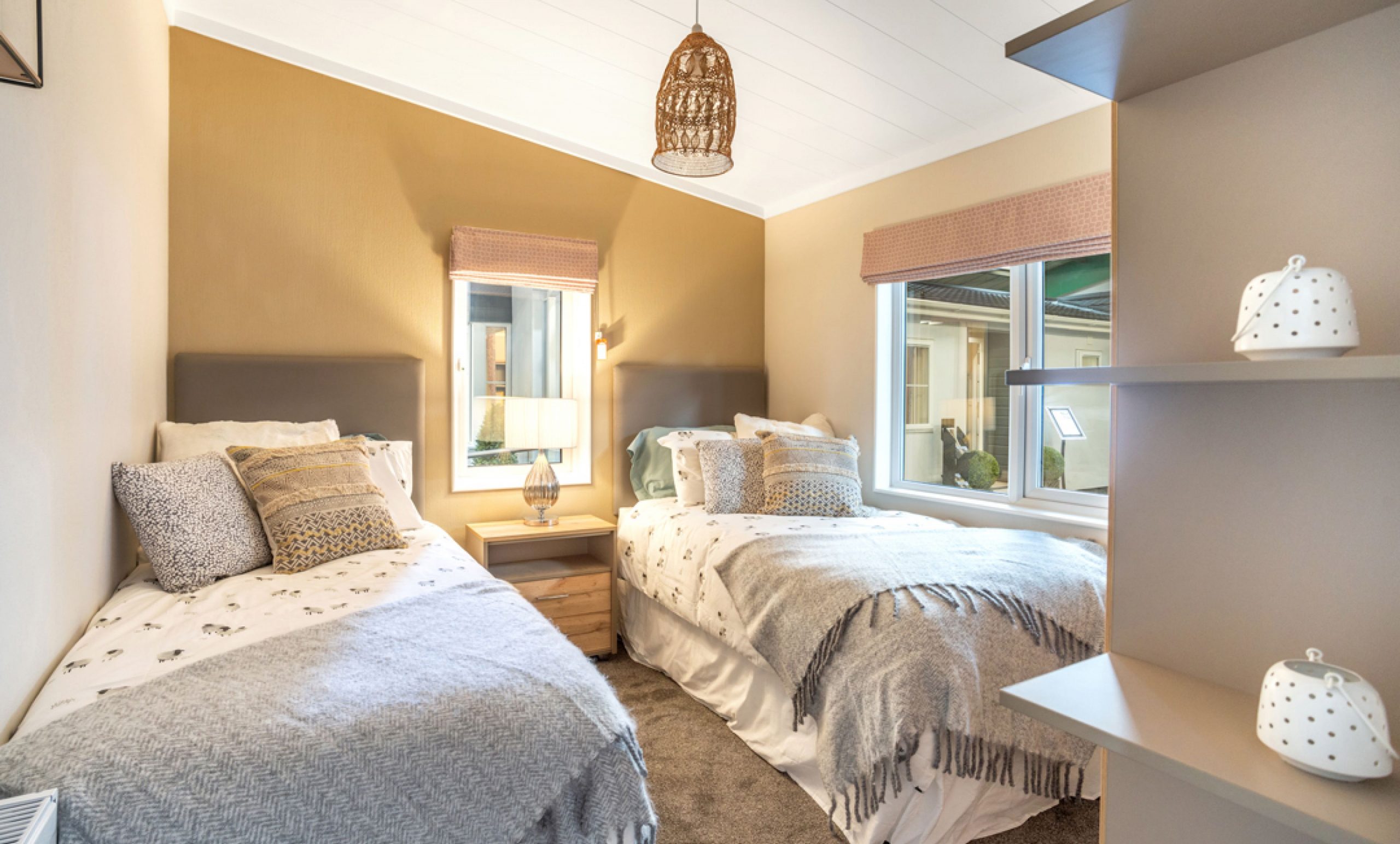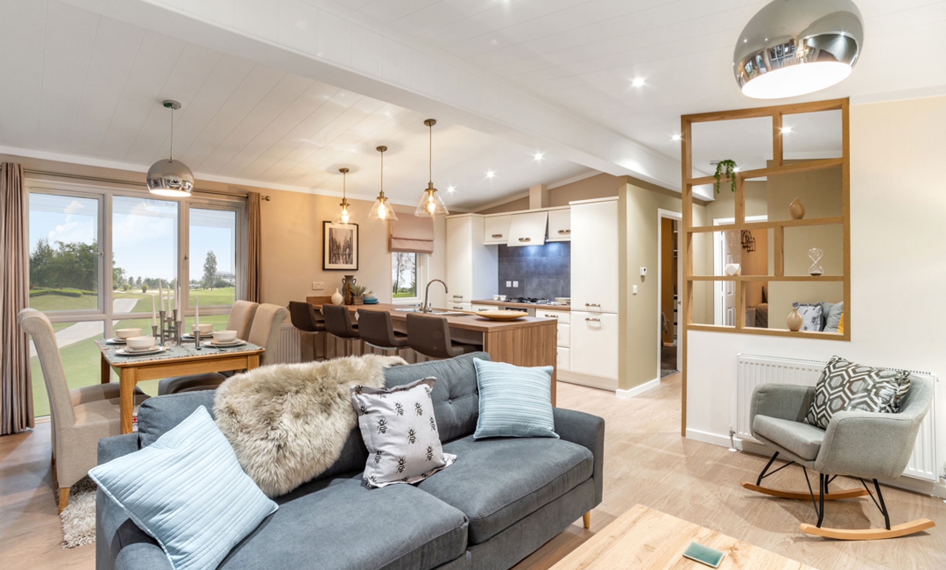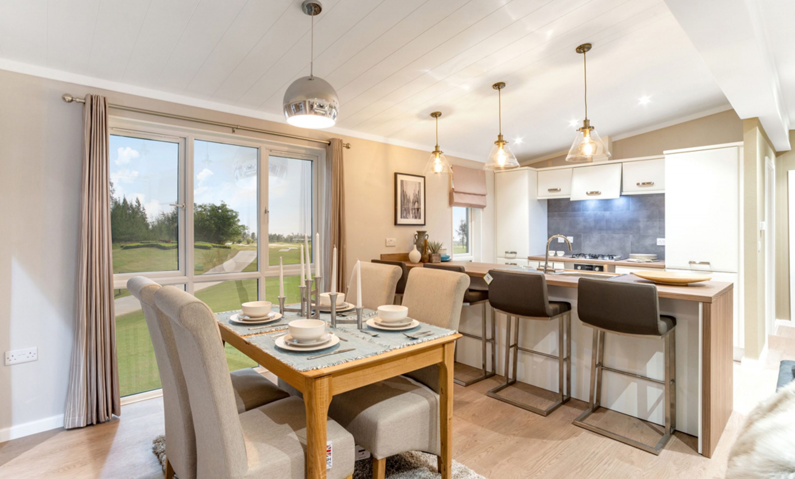 Offering low maintenance, comfortable and spacious with mains gas central heating. Block paved parking in front of the home for 2 cars. A modern, Nordic style home with open plan layout combining clean and light spaces with large windows to the lounge and dining area. Tongue and grooved vaulted ceilings throughout. Elegant Scandinavia design offers an inherent cosiness with a calming grey, taupe and linen colour scheme.