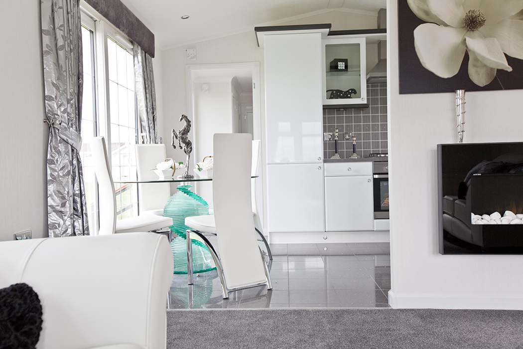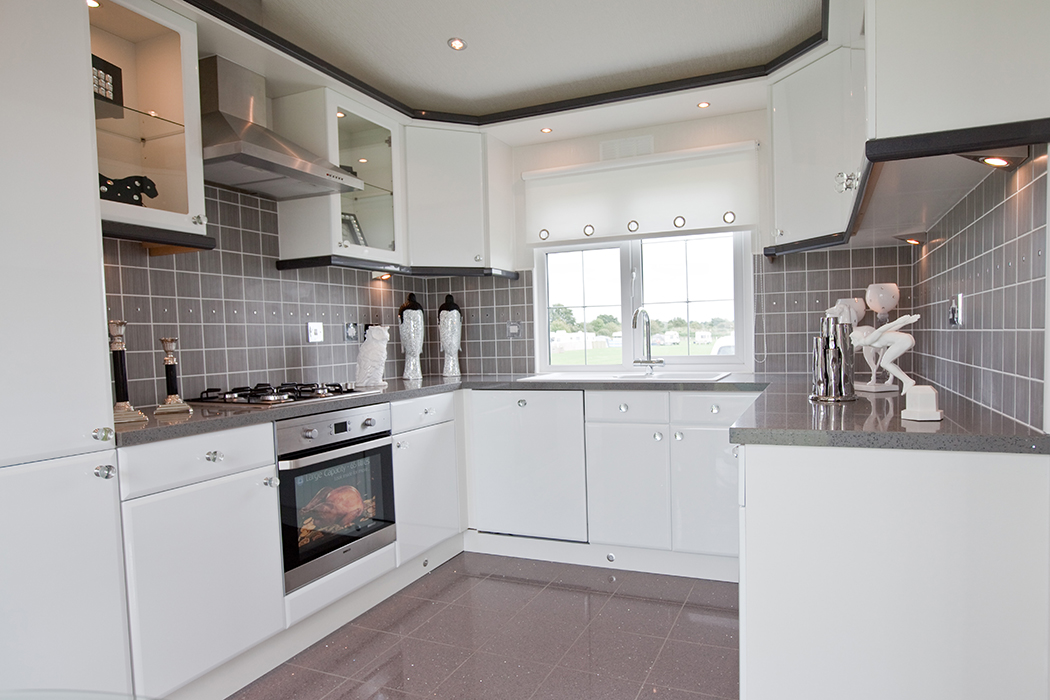 Brand new 40×14 Stately-Albion Crystal Park Home which has been designed with luxury in mind. The exterior front has 3 gables with down lights, drop bay windows, chrome Georgian bars and glazed front door with side screens. French doors with side panels have been fitted to the lounge to allow light to flood the interior. The kitchen is fully integrated to include high level oven and microwave, hob, extractor fan, fridge/freezer, washer/dryer and dishwasher. Tiled floor and walls are complimented with granite worktops, lights are fitted to glazed cupboards and plinths. The shower room is completely tiled with a large spacious shower. The home has 2 double bedrooms with fitted wardrobes and comes completely furnished and fitted throughout with coordinating interior furnishings and colour theme flowing throughout the home. Offering low maintenance, comfortable and spacious with mains gas central heating.